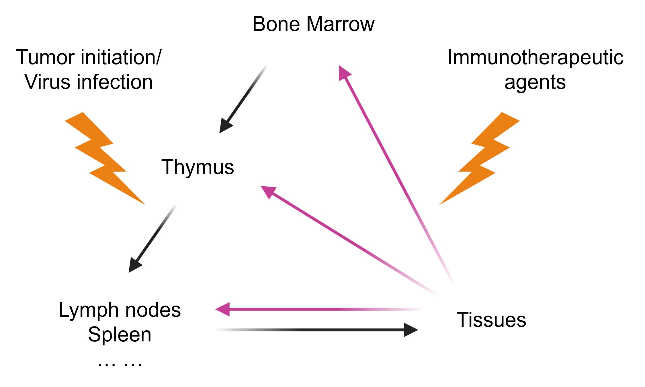 Based on this perspective, our lab gradually stepped into two intertwined themes: (1) how pathological processes (tumor progression or infection in a tissue) alter the communication between tissues and lymphoid organs; and (2) how immunotherapeutic agents can induce systemic “butterfly effect” perturbations across multiple organs of the immune system. To address these themes, we have developed specific directions as detailed below.